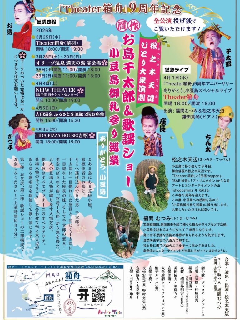 小豆島に移り住んで9年目、「Theater箱舟」と「民宿teppen」、「BAR妙音」、「アトリエタタン」からなるアートとエンターテイメントの山「shodoshima 开 KAI」もこの春9周年を迎えます。